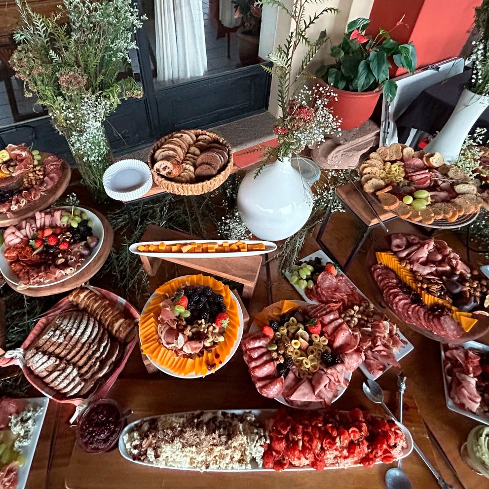 Una selección de quesos y carnes frías acompañada de aderezos, mermeladas y panes artesanales, perfecta para compartir y complementar tu evento.